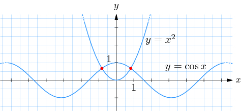 By drawing the graphs \displaystyle y=\cos x and \displaystyle y=x^2 we see that the curves intersect in two points. So there are two x-values for which the corresponding y-values are equal. In other words, the equation has two solutions.