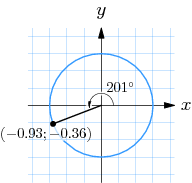\displaystyle \begin{align*} \cos 201^\circ &\approx -0\mbox{.}93\\[8pt] \sin 201^\circ &\approx -0\mbox{.}36\\[8pt] \tan 201^\circ &\approx \dfrac{-0\mbox{.}36}{-0\mbox{.}93} \approx 0\mbox{.}4\\ \end{align*} |