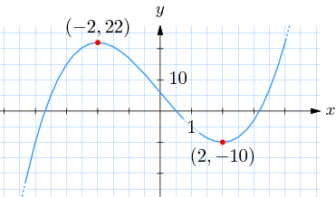 The curve has thus local minimums at \displaystyle (–2, –20) and \displaystyle (1, 7) and a local maximum at \displaystyle (0, 12).