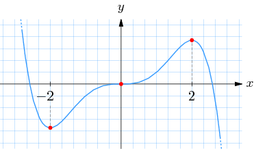The function in the above figure has a local minimum for \displaystyle x = -2, a point of inflection for \displaystyle x = 0 and a local maximum for \displaystyle x = 2.
