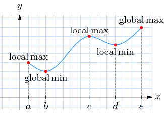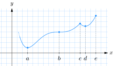 For the function below there are four extreme points: maximum at \displaystyle x=c and \displaystyle x=e, and minimum at \displaystyle x=a and \displaystyle x=d.