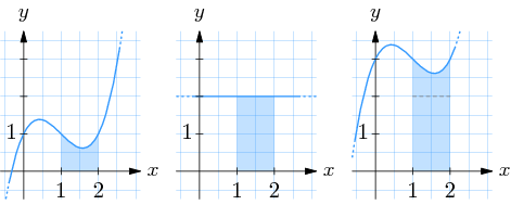 The left diagram shows the area below the graph for f(x) = x³ - 3x² + 2x + 1 and the middle diagram shows the area below the graph for g(x) = 2. In the diagram on the right these areas are summed and give the area below the graph for f(x) + g(x).