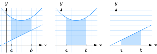 | If f(x) and g(x) take positive values and f(x) is greater than g(x), the area between the graphs of f and g (the figure on the left) can be obtained as the difference between the area below the graph f (figure in the middle) and the area below the graph g (the figure on the right). |