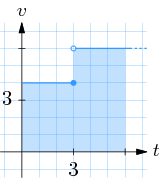 | The object moves at a constant speed of 5. | The object moves at a steady speed of 4 when an impact at t = 3 suddenly increases the speed to 6. | The object is sliding down a sloping plane and has a linearly increasing speed. |