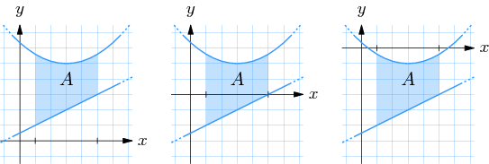 | The area between the two graphs is not affected if the graphs are moved in the y-direction. The area between the graphs of f(x) and g(x) (figure on the left) is equal to the area between the graphs of f(x) - 3 and g(x) - 3 (the figure in the middle), as well as the area between the graphs of f(x) - 6 and g(x) - 6 (figure on the right). |