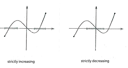 The function is strictly increasing (it has a tangent that slopes upwards) in the interval between the left endpoint and \displaystyle x=a, as well as between \displaystyle x=b and the right endpoint. In the interval between \displaystyle x=0 and \displaystyle x=b, the function is strictly decreasing.