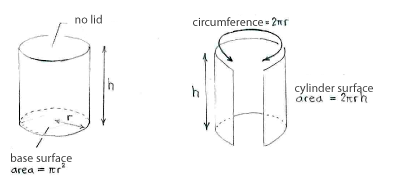 If we call the radius of the metal can r and its height h, then we can determine the can's volume and area by using the figures below,