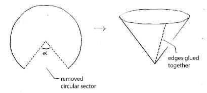 When we cut out a circular sector of angle \displaystyle \alpha from a circular disk, the remaining part of the circular disc's periphery will have length \displaystyle (2\pi-\alpha)R, where \displaystyle R is the radius of the circular disc. This periphery will then become the cornet's upper circular edge, which therefore has the same circumference.