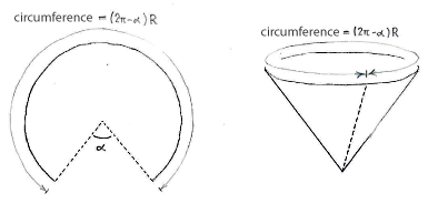 | \displaystyle 2\pi r = (2\pi-\alpha)R\quad\Leftrightarrow\quad r = \frac{2\pi -\alpha}{2\pi}\,R\,\textrm{.} |