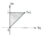 All together, the inequalities define the region which the unit square and the half-plane have in common: a triangle with corner points at \displaystyle 0, \displaystyle i and \displaystyle 1+i.
