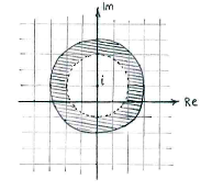 In words, the inequality says that the distance \displaystyle |z-i| between \displaystyle z and \displaystyle i should be strictly greater than 2 and less than or equal to 3. This means that the inequality defines an annular set having an inner radius of 2 and outer radius of 3, with centre at \displaystyle i.
