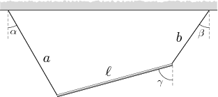 A rod of length \displaystyle \,\ell\, hangs from two ropes of length \displaystyle \,a\, and \displaystyle \,b\, as shown in the figure. The ropes make angles \displaystyle \,\alpha\, and \displaystyle \,\beta\, with the vertical. Determine a trigonometric equation for the angle \displaystyle \,\gamma\, which the rod makes with the vertical.