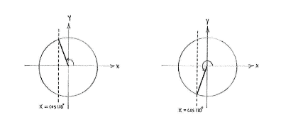 There is then a further solution which satisfies \displaystyle 0^{\circ}\le 2v + 10^{\circ}\le 360^{\circ}, where \displaystyle 2v+10^{\circ} lies in the third quadrant and makes the same angle with the negative y-axis as \displaystyle 100^{\circ} makes with the positive y-axis, i.e. \displaystyle 2v + 10^{\circ} makes an angle \displaystyle 110^{\circ} - 90^{\circ} = 20^{\circ} with the negative y-axis and consequently
