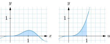 | The figure on the left shows the graph of the integrand sin³x cos x and the figure on the right the graph of integrand u³ which is obtained after the variable substitution. The change of variable modifies the integrand and the interval of the integration. The integrals value, the size of the area, is not changed however. |