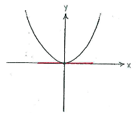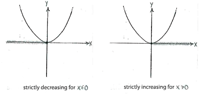 To the left of \displaystyle x=0, the derivative is negative (the tangent slopes downwards) and the function is strictly decreasing, and to the right of \displaystyle x=0 the derivative is positive (the tangent slopes upwards) and the function is strictly increasing.
