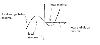 Furthermore, we see that the function has local minimum points at the left endpoint of the interval of definition and \displaystyle x=b, because the function takes higher values at neighbouring points. In the same way, we see that the function has local maximum points at \displaystyle x=a and at the right endpoint of the interval of definition.