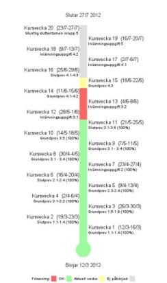De avklarade momenten markeras med grön färg. Det du förväntas göra under aktuell vecka är markerad med gult. Om du är försenad så blir det rött.
