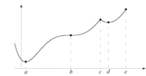 Funktionen nedan har fyra extrempunkter; maxpunkter i $\,x=c\,$ och $\,x=e\,$, och minpunkter i $\,x=a\,$ och $\,x=d\,$.