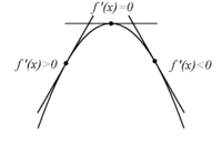 • lokal maximipunkt med $\,f^{\,\prime}(x) > 0\,$ till vänster, och $\,f^{\,\prime}(x) < 0\,$ till höger om punkten.