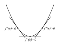 • lokal minimipunkt med $\,f^{\,\prime}(x) < 0\,$ till vänster, och $\,f^{\,\prime}(x) > 0\,$ till höger om punkten.