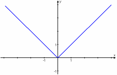 Funktionen $ f(x)=|x|$ saknar derivata då $x=0$. Man kan nämligen inte bestämma hur funktionens graf lutar i punkten $(0,0)$ (se fig).